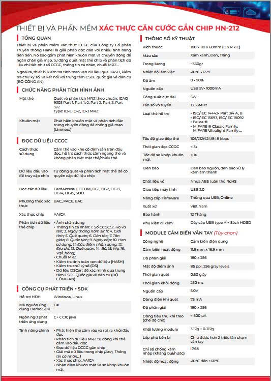 Thiết bị HN-212 của Hanel là dòng sản phẩm “Make in Vietnam”, được tin dùng rộng rãi nhờ khả năng đọc chính xác, tốc độ nhanh và dễ tích hợp. Việc kết hợp cả đầu đọc và camera giúp xác thực đồng thời thẻ và khuôn mặt – bảo vệ quy trình đăng nhập, ký số hoặc truy cập dữ liệu cá nhân một cách an toàn tuyệt đối.