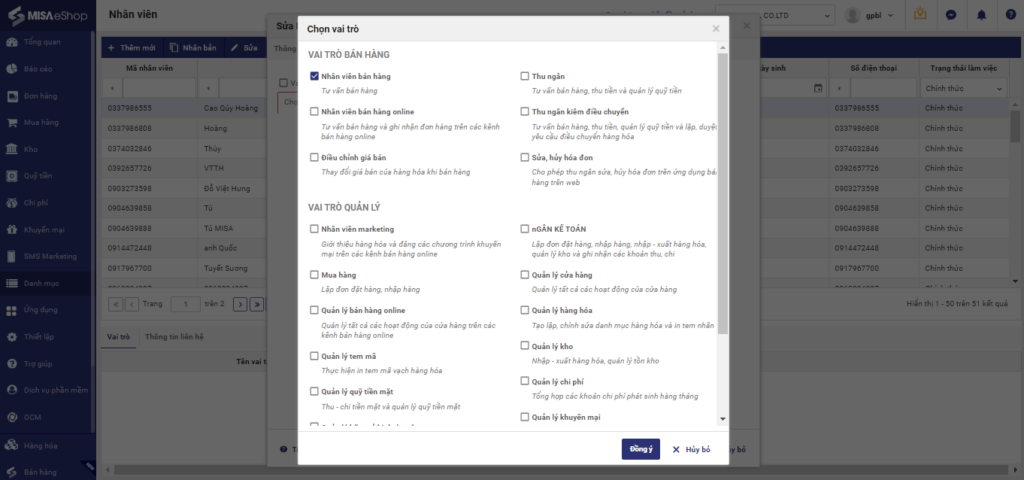 - Đối với những cửa hàng tiện lợi, cửa hàng tạp hóa quy mô nhỏ và vừa: Số lượng nhân viên bán hàng ít (thường 1-2 người) và làm theo ca. Yêu cầu công việc đơn giản là bán hàng, tính tiền và in hóa đơn cho khách hàng thì bạn có thể chọn vai trò Nhân viên bán hàng.